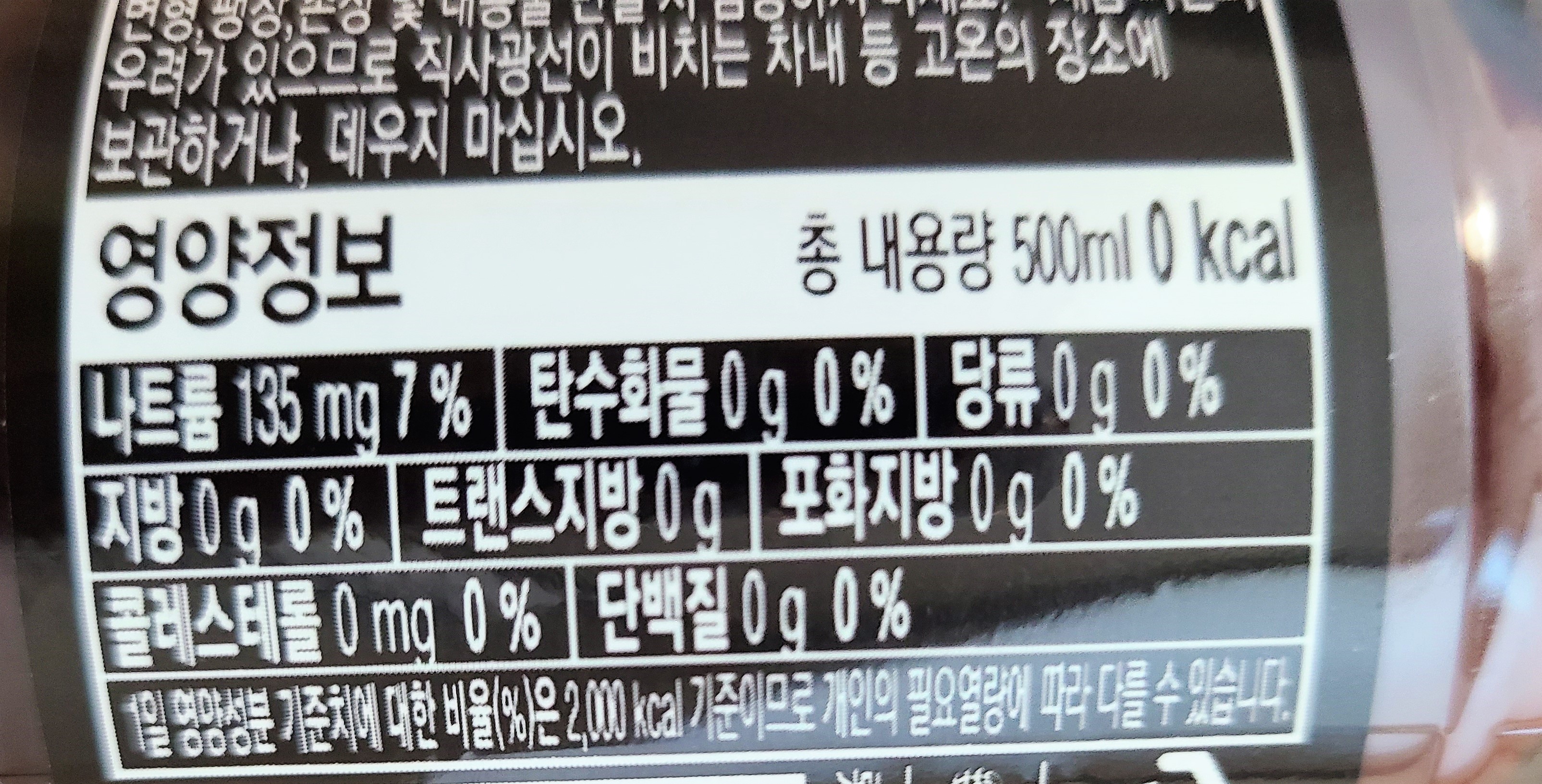 탄수화물, 당류, 지방, 트랜스지방, 포화지방, 콜레스테롤, 단백질 모두 0g, 0%입니다.