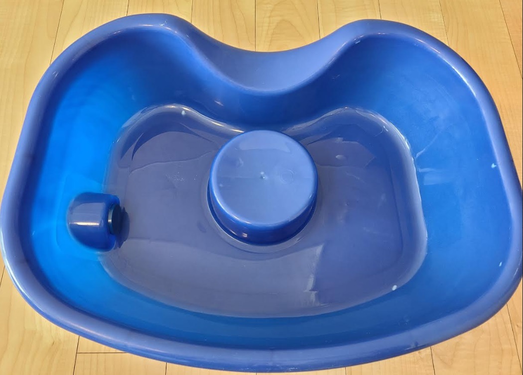 일반 대야와는 달리 물 빠지는 배수구멍과 머리를 받칠 수 있는 동그란 받침대가 있습니다.