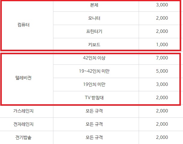 컴퓨터 버릴때도 비용이 발생합니다. 부품별로 컴퓨터 본체 3,000원 모니터 2,000원 등으로 가격이 안내되어있어요.