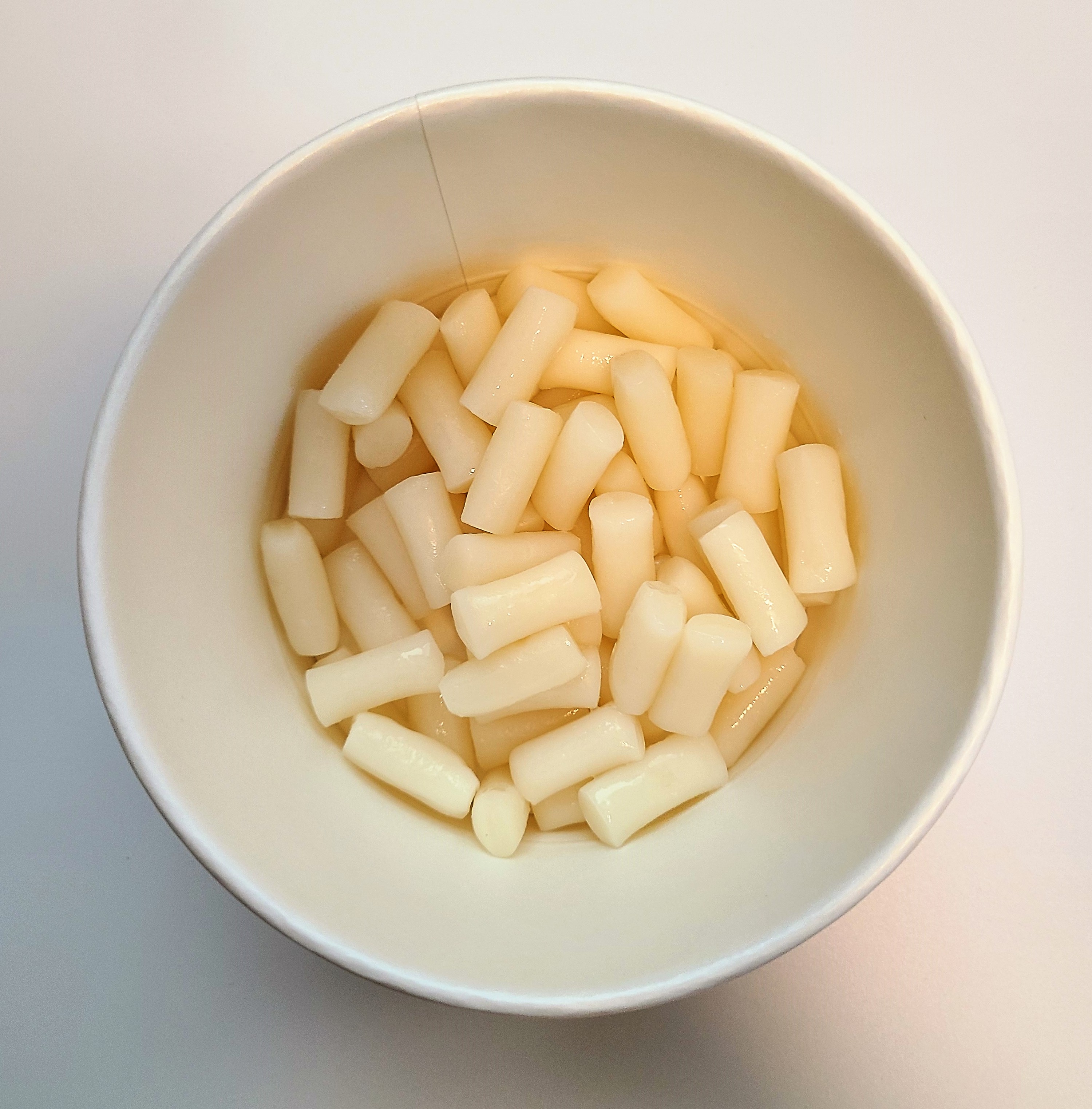 떡은 보통 편의점 컵떡볶이에 들어가는 작은 쌀떡이에요. 쫄깃한 식감이긴 한데 크기는 좀 작습니다