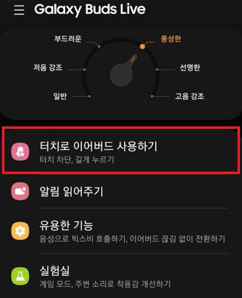 1. 갤럭시 웨어러블 앱을 실행한 후 '터치로 이어버드 사용하기'를 눌러주세요