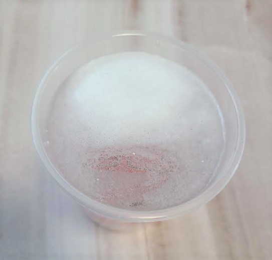 1. 세정컵에 30도~40도 정도의 미온수(150ml~200ml)를 준비한 뒤 틀니(교정기)와 제품 1정을 넣습니다.