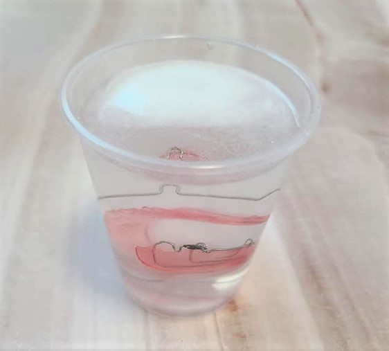 2. 틀니(교정기)를 세정액에 5분 정도 담가 놓습니다. 틀니를 사용하기 전에는 물로 가볍게 헹궈서 사용해주세요