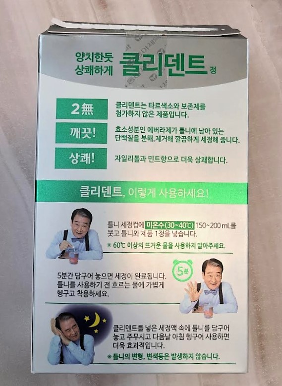 틀니를 더 깨끗하게 세척하고 싶으시다면 취침전에 클리덴트를 넣은 세정액에 교정기나 틀니를 담근 후 아침에 사용해주세요